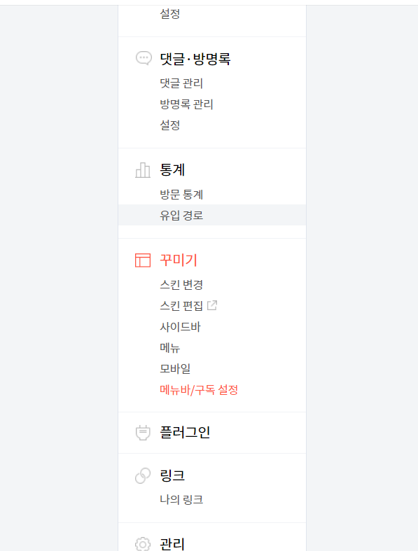 [블로그 관리] -> [꾸미기]에 들어가시면 [메뉴바/구독 설정]이 있습니다. 이걸 클릭합니다.