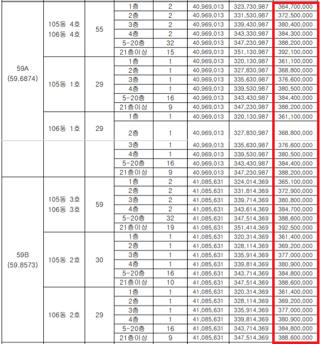 59형은 약 25평 정도로 3억 6110만 원 ~ 3억 8860만 원입니다.