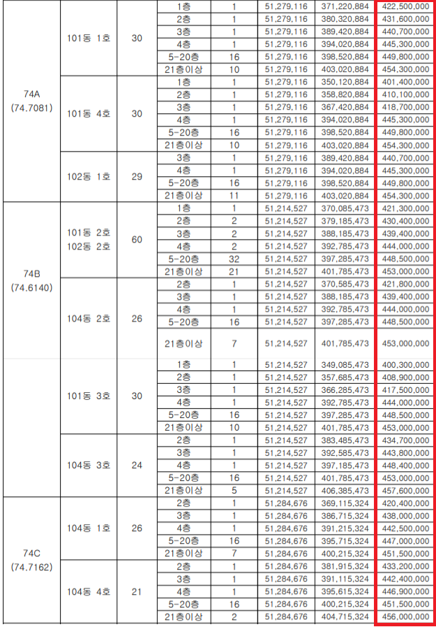 74형은 구 평수로 약 30평 정도이며 분양가는 4억 2040만 원 ~ 4억 5600만 원 선입니다.