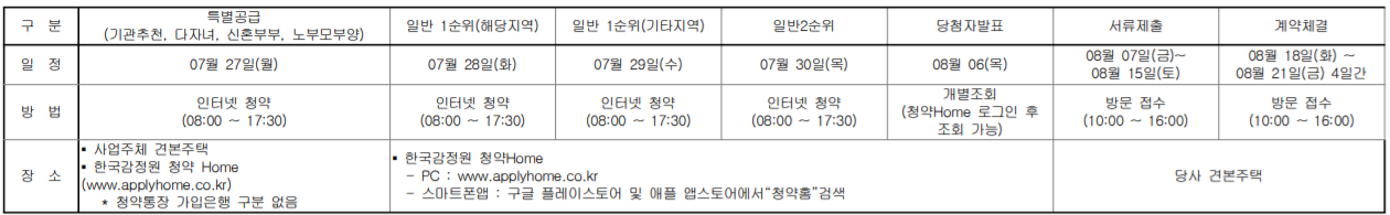 특별공급 7월 27일을 시작으로 7월 28일 일반 1순위 7월 30일 일반 2순위가 있으며 8월 6일 당첨자 발표가 있습니다.