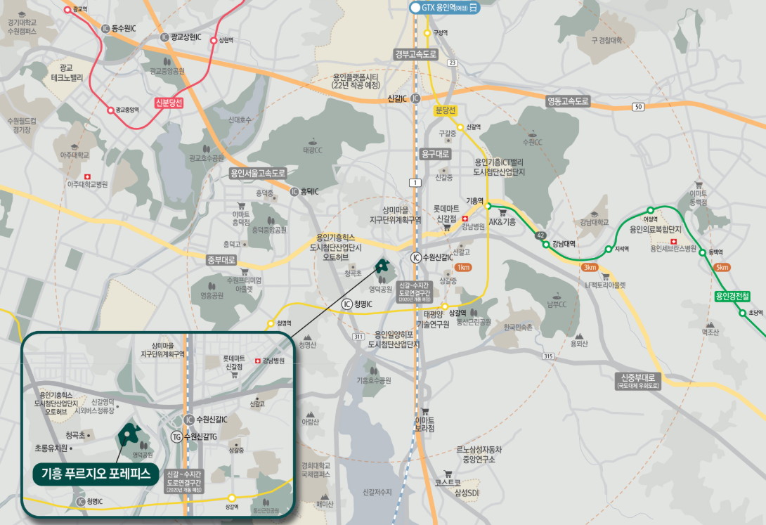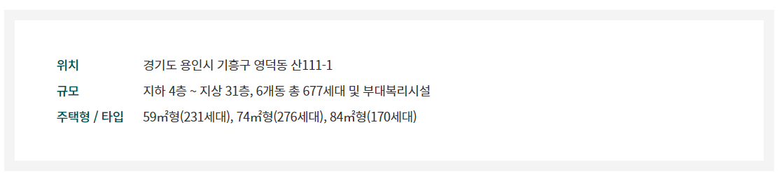 경기도 용인시 기흥구 영덕동 산 111-1 일대 지하 4층 ~ 지상 31층 6개 동 총 677세대로 특별공급 290세대 일반분양 387세대입니다. 23년 5월 입주 예정입니다. 경부고속도로, 영동고속도로, 용서고속도로 초근접 이용 가능하며 분당선 기흥역 인접, GTX 용인역(예정) 광역버스를 통한 서울 강남, 종로, 송파 등 출퇴근 용이하고 교육 및 생활편의가 높은 편리한 생활환경으로 청곡초, 초롱유치원, 신갈중, 구갈중, 신갈고 등 인접한 학세권과 광교, 영통, 기흥, 동백, 흥덕 등 주요 생활권을 모두 누릴 수 있는 곳으로 롯데프리미엄아울렛(기흥점), IKEA(기흥점), 코스트코(공세점), AK&(기흥), 롯데마트(신갈점), 이마트(보라점) 등 대규모 편의시설 인접해 있습니다. 공원 특례화 사업을 통한 쾌적한 자연환경단지를 둘러싼 공원 특례화 사업을 통한 숲세권 프리미엄태광CC, 남부CC, 수원CC 등 다양한 골프장 및 연습시설로 풍요로운 여가 생활을 누릴 수 있습니다.