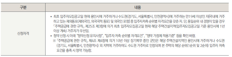 최초 입주자 모집 공고일 현재 용인시에 거주하고나 수도권에 거주하는 만 19세 이상인 자로 입주자저축 순위별 자격 요건을 갖추어야 합니다. 동일 순위 내에서 경쟁 시 입주자 모집 공고일 기준 용인시에 1년 이상 거주자가 우선입니다.