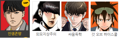뭐 이런 것들이다. 네이버 웹툰 상위를 유지하고 있다. 급식 감성에 폭력을 붙인 이 장르에서 박태준은 독보적이다. 이 장르가 그냥저냥 보기에도 편하고 수가 가장 많기도 하고 여러 급식 친구들과 과거 향수에 빠져있는 친구들에게 인기가 좋은 듯하다. 이런 만화는 나도 어렸을 땐 재밌게 봤었다. 우리 시대에 맞추자면 짱이 딱 이 장르가 아닐까? 연령대가 낮은 네이버에 딱인 웹툰들이다.