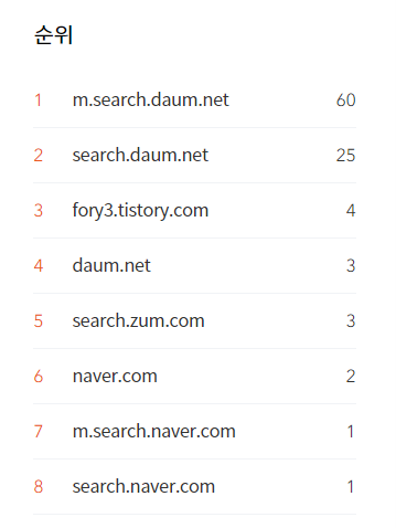모바일 41%, PC 59%로 PC 유입량이 더 많게 나오는데 이 점은 네이버 블로그를 운영할 때와는 많이 다른 모습을 보여 의외입니다. 원인은 아무래도 맛집 포스팅이 많은 네이버 블로그는 모바일을 주로 사용해 검색하며 각종 정보를 취급하는 티스토리 블로그는 PC로 주로 검색하지 않았나 생각합니다.