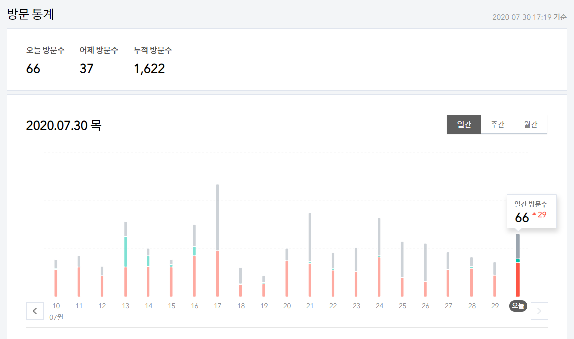 7월 30일 5시 기준으로 현재 월 방문자 수 1716명으로 평균 방문자 수 일 57.2명입니다.