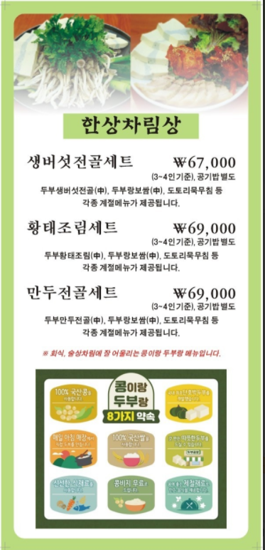 방문자리뷰 335 · ★4.57 · [20인이상 단체예약 이벤트] 20명이상 '두부랑정식'메뉴로 네이버 단체예약 하시면 귀가시 순수100% 콩물 2병 900ml*2 증정해드리겠습니다