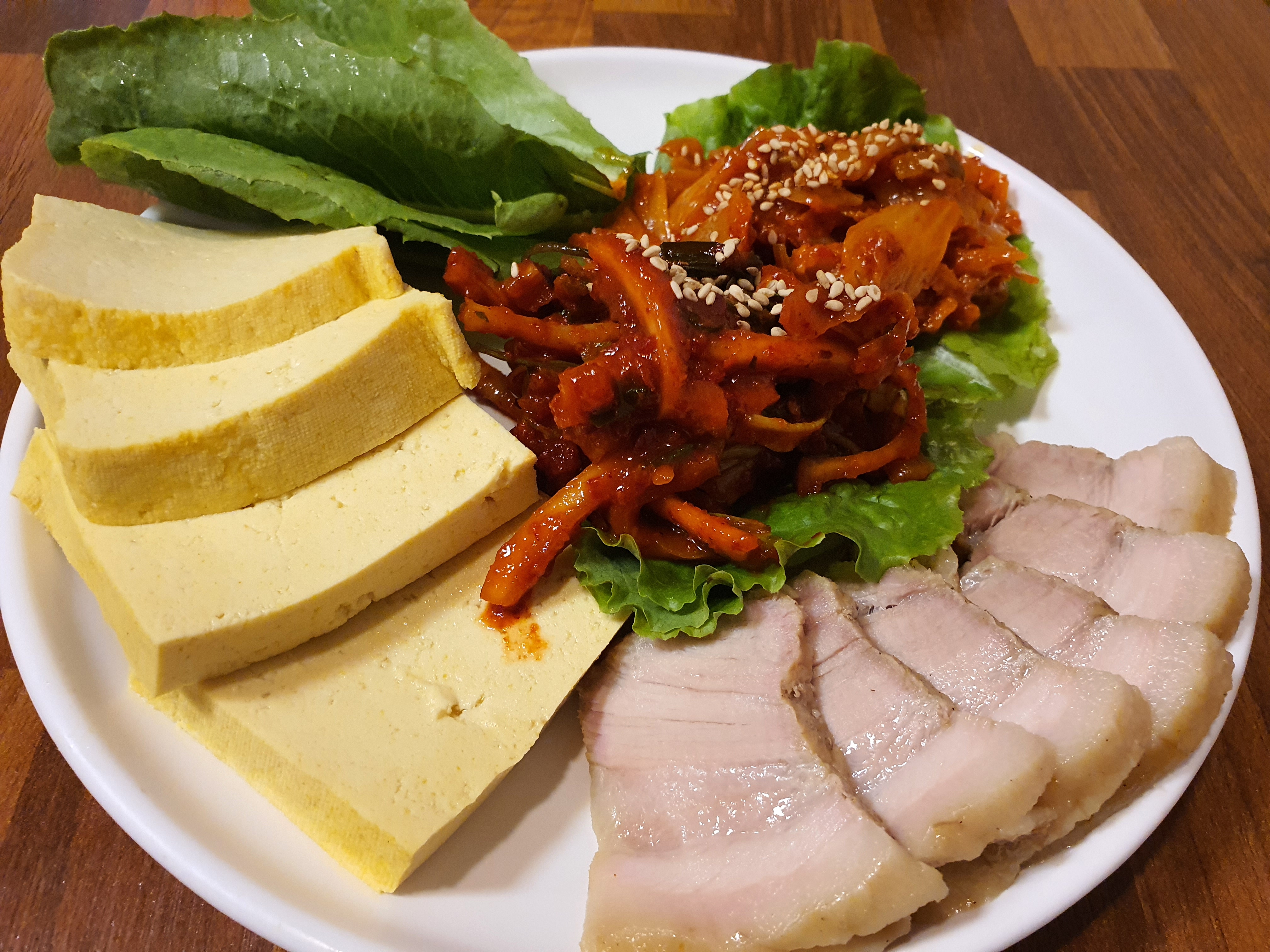 보쌈과 두부입니다. 두부는 특이하게 약간 노란 빛을 띄고 있습니다.