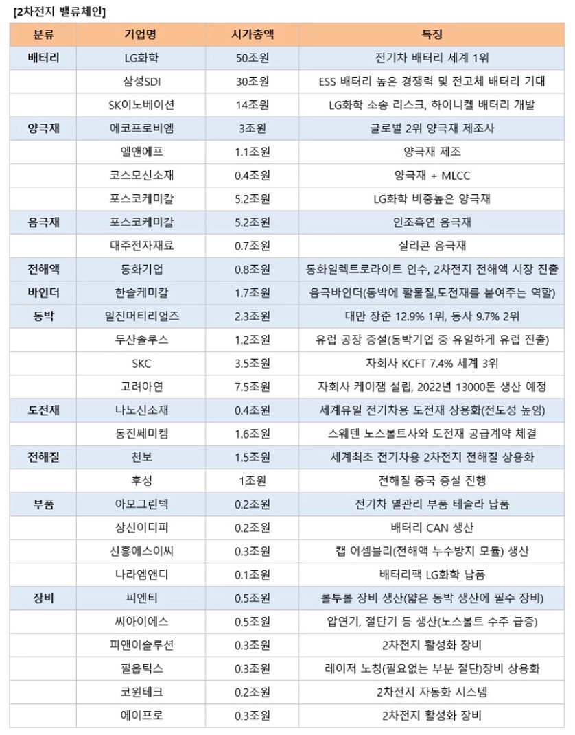삼프로 티비 증시 염탐정 염승환 차장님이 작성한 2차전지 밸류체인 표입니다.