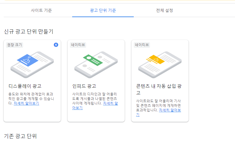 [광고] -> [광고 단위 기준]에 들어가시면 광고의 종류가 여러 가지가 있습니다.