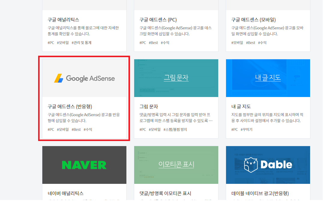 먼저 [블로그 관리] -> [플러그인]에 들어가 보시면 구글 애드센스(반응형)이란 플러그인이 있습니다.