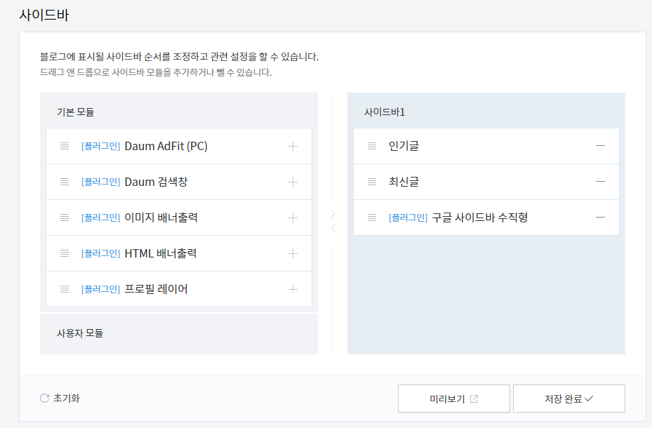 [블로그 관리] -> [사이드바] 에서 사이드 바를 만들고 코드를 복사 붙여 넣기만 하면 끝입니다.