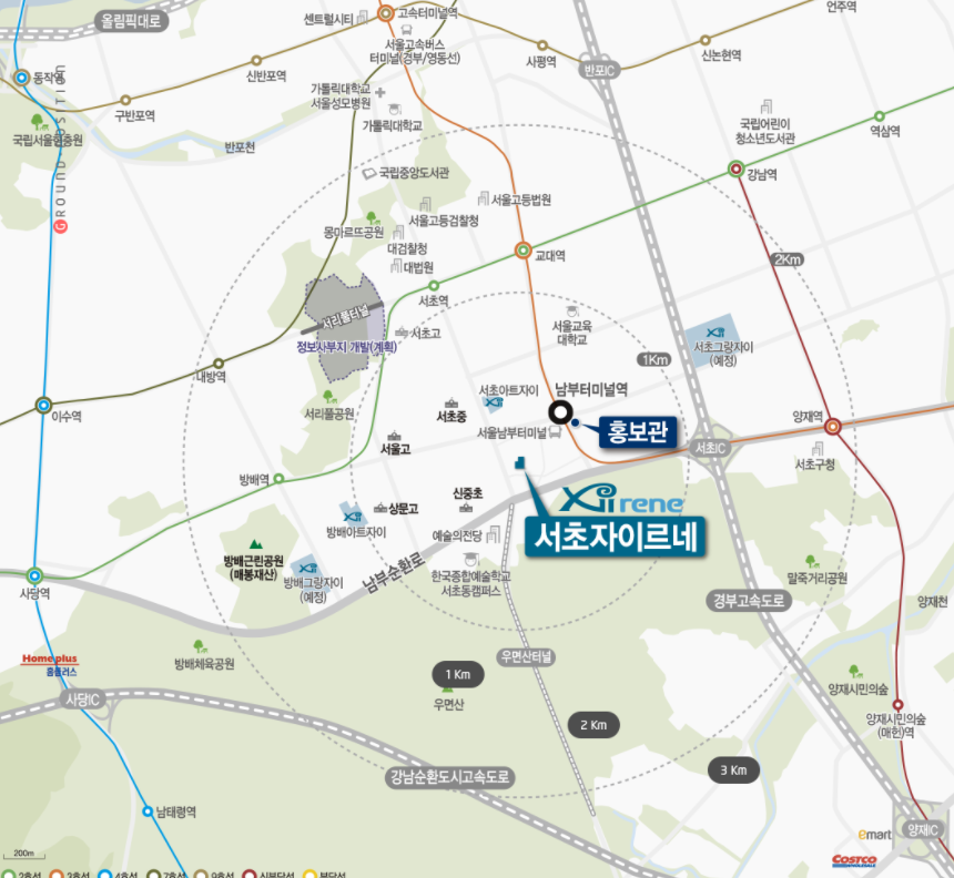 서초 자이르네는 3호선 남부터미널 도보 역세권을 갖추고 있으며, 서초대로, 남부순환로, 경부고속도로 등 다양한 도로망을 갖춘 교통 중심지일 뿐만 아니라 서울고, 서초고, 상문고, 동덕여고 등 강남 8학군과 서울교대, 한국예술종합학교 등 우수한 명문 학군을 갖추고 있습니다. 우면산 숲세권에 예술의 전당, 국립중앙도서관 등이 인접한 고품격 문화시설에 실속형 소형평면구성의 프리미엄을 갖추고 있습니다.